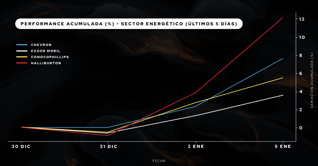Las acciones energéticas estadounidenses, incluyendo grandes petroleras y empresas de servicios petroleros, registraron ganancias significativas, impulsadas por expectativas de que podrían tener un papel importante en la recuperación de la producción de crudo en Venezuela.