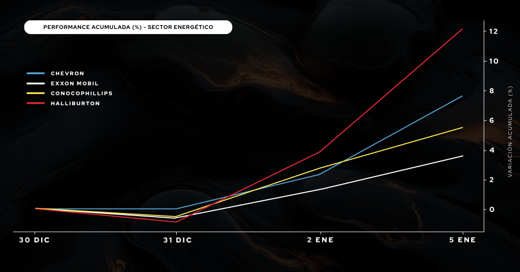 Las acciones energéticas estadounidenses, incluyendo grandes petroleras y empresas de servicios petroleros, registraron ganancias significativas, impulsadas por expectativas de que podrían tener un papel importante en la recuperación de la producción de crudo en Venezuela.